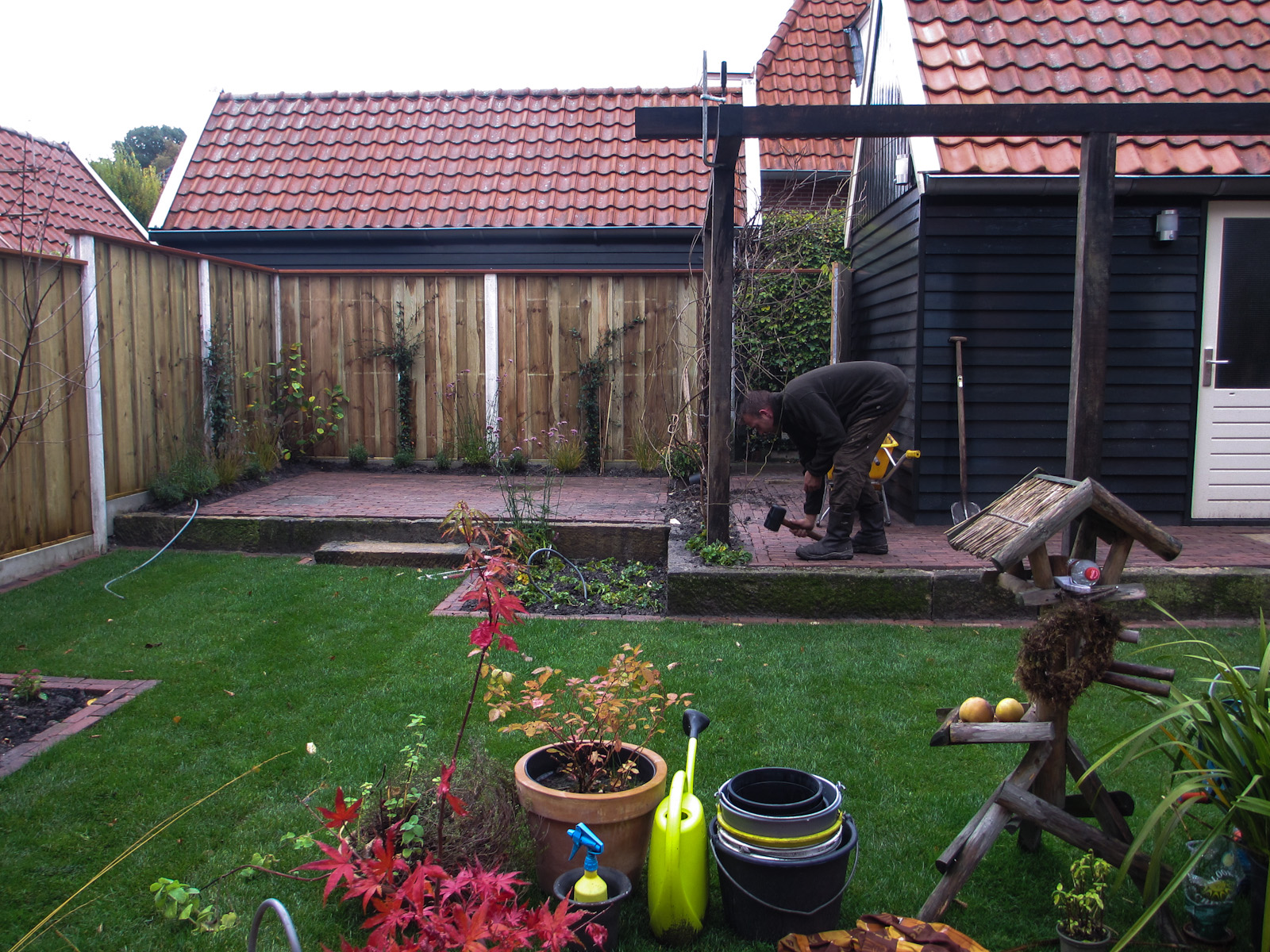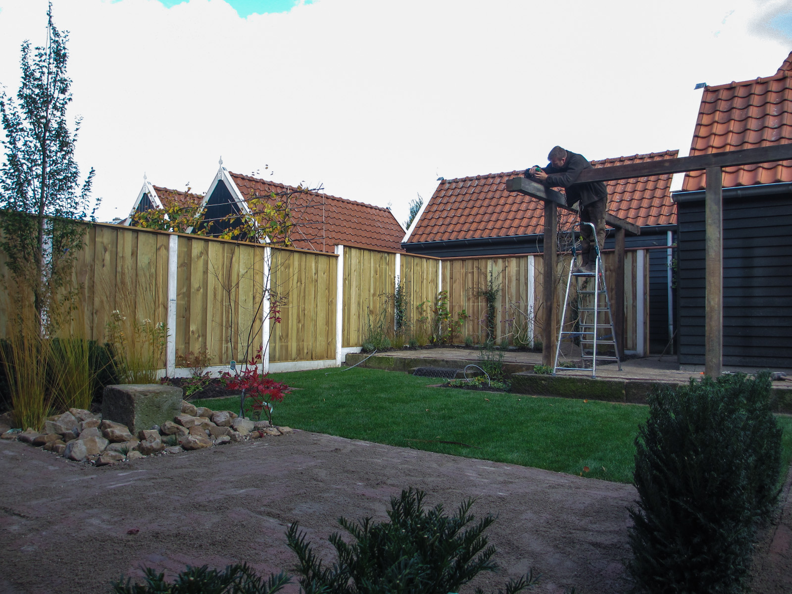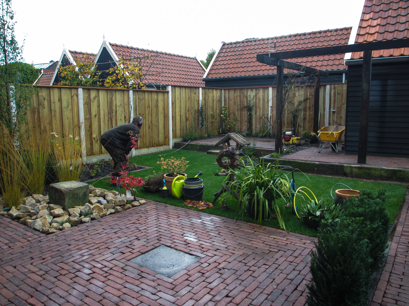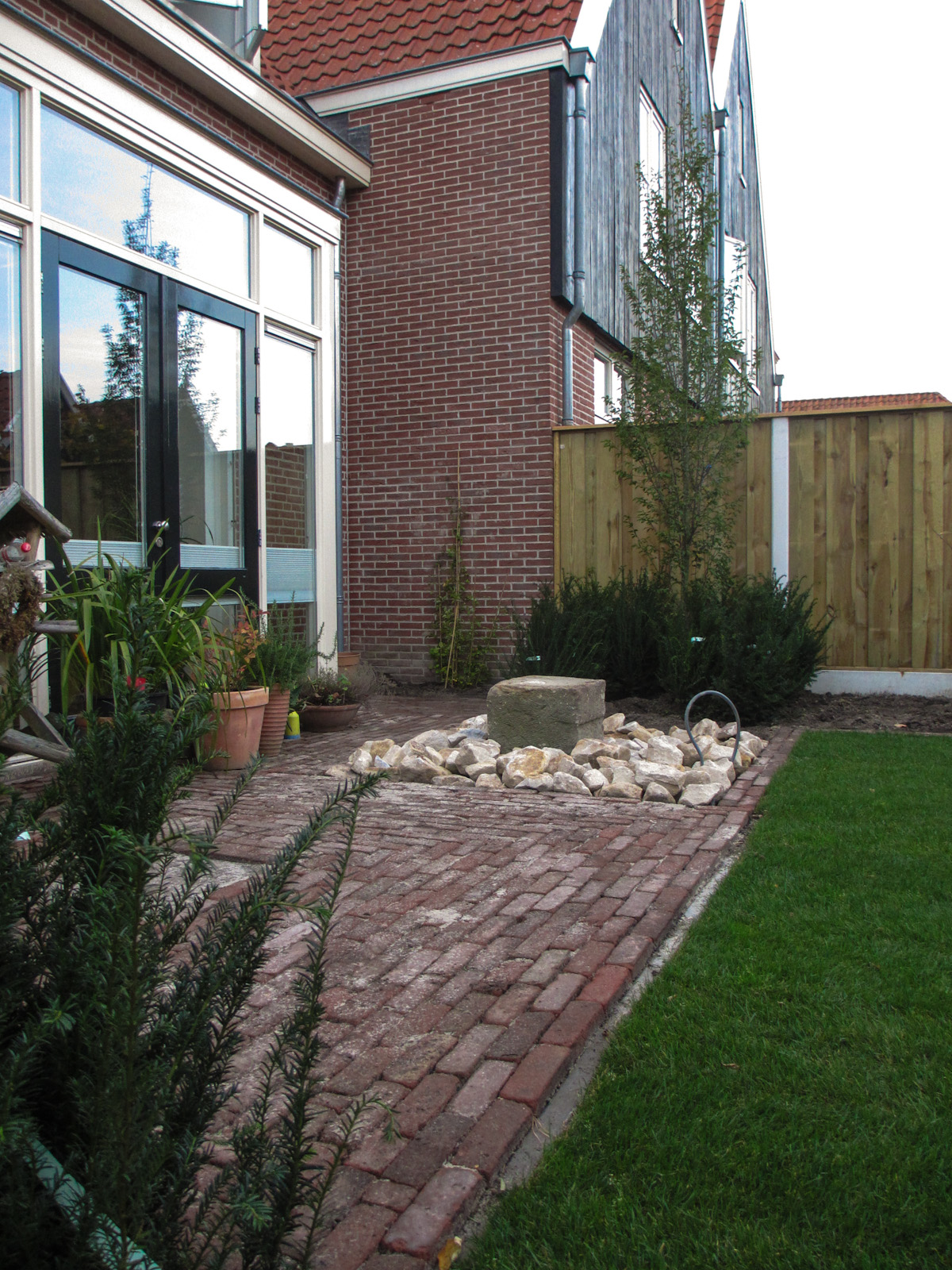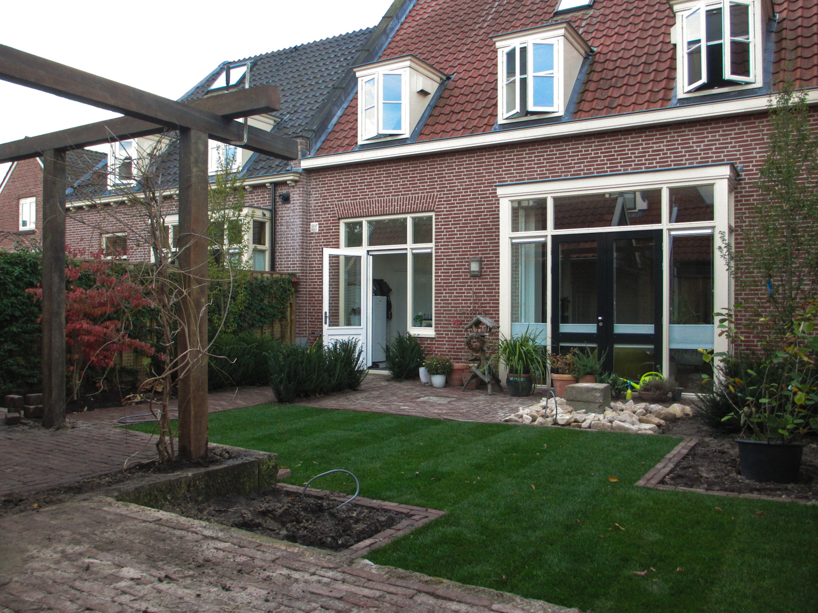 Deze tuin is een goed voorbeeld van een veelzijdige tuin qua inrichting. Een strakke indeling; voorzien van gazon, sierstraatwerk, fontein en pergola. De pergola is door ons gemaakt van gebruikt hardhout.